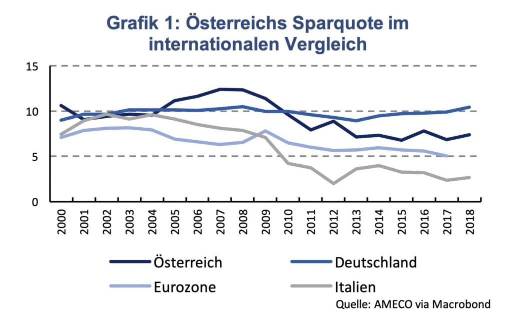 Österreichs Haushalte gelten als durchaus sparfreudig. Im Jahr 2018 wurden 7,4 % des verfügbaren Einkommens privater Haushalte nicht für den Konsum verwendet, sondern stattdessen gespart. Im internationalen Vergleich liegt Österreich damit im oberen Mittelfeld, über der Eurozone aber hinter Deutschland (Grafik 1). Während sich die Sparquote in Deutschland vergleichsweise konstant entwickelt hat, diese liegt bei etwa 10 %, gab es in Österreich seit der Finanz- und Wirtschaftskrise einen deutlichen Rückgang. In Italien ist dieses Phänomen sogar noch stärker ausgeprägt. Hier lag die Sparquote privater Haushalte im Jahr 2018 bei nur 2,6 %, obwohl das Ausgangsniveau in den frühen 2000er Jahren in Deutschland, Österreich und Italien ähnlich war.