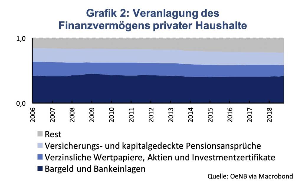 Die rege Spartätigkeit der Österreicherinnen und Österreicher unterstützt den langfristigen Vermögensaufbau. Ende 2018 betrug das Finanzvermögen privater Haushalte 661 Milliarden Euro, der Zufluss an Finanzmittel im Gesamtjahr lag bei 13 Milliarden Euro (OeNB). Das Anlageverhalten gilt jedoch als risikoavers, sichere Anlageformen, wie beispielsweise das Sparbuch, sind sehr beliebt. Rund 40 % des Finanzvermögens wird in Form von Bargeld gehalten oder in Bankeinlagen veranlagt. Risikobehaftete Anlageformen, wie Anleihen, Aktien und Investmentzertifikate machen hingegen nur rund ein Fünftel des Finanzvermögens der Haushalte aus. Anlageformen, die einen direkten Bezug zur langfristigen Altersvorsorge aufweisen, wie Versicherungs- und kapitalgedeckte Pensionsansprüche, haben ein ähnliches Ausmaß (etwa 20 %). Der Rest ist maßgeblich durch Beteiligungen an Nicht-Aktiengesellschaften, wie Familienbetriebe, getrieben. Trotz des aktuellen Niedrigzinsumfelds haben sich die relativen Anteile des Finanzvermögens nicht maßgeblich verändert (Grafik 2).