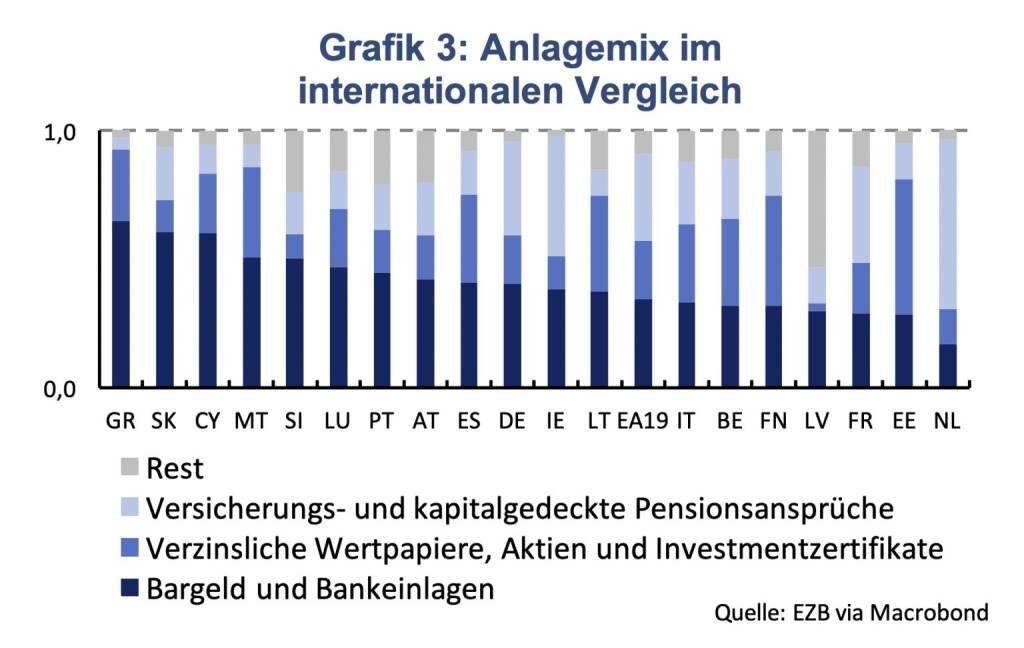 Im internationalen Vergleich zeigt sich der Anlagemix österreichischer Haushalte als eher konservativ, dennoch gibt es einige Länder in welchen dem Sparbuch eine noch größere Bedeutung zugeordnet wird, wie etwa Griechenland (Grafik 3). Vergleicht man Österreich mit der Eurozone (EA19) zeigt sich ein höherer Anteil von Bargeld & Bankeinlagen (42 % vs. 35 %), ein kleinerer Anteil von Anleihen, Aktien und Investmentzertifikaten (17 % vs. 23 %) sowie von Versicherungs- und kapitalgedeckten Pensionsansprüchen (20 % vs. 34 %). In den Niederlanden beträgt der Anteil der kapitalgedeckten Altersvorsorge sogar 66 %, während man in Österreich vorwiegend auf das umlagefinanzierte staatliche Pensionssystem vertraut. Im Jahr 2018 gab es in Österreich sogar einen Vermögensabbau der Altersvorsorge (Versicherungs- und kapitalgedeckte Pensionsansprüche) von 1,3 Milliarden Euro. Finanzanlagen wurden stattdessen vorwiegend in Form von Bargeld und Bankeinlagen getätigt.