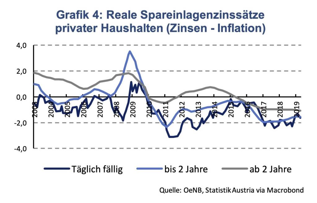 Die große Beliebtheit von Bankeinlagen hat im gegebenen Niedrigzinsumfeld jedoch negative Konsequenzen für die langfristige Vorsorge. Spareinlagezinssätze von privaten Haushalten sind seit der Finanz und Wirtschaftskrise 2008-09 deutlich gesunken. Zinssätze auf Spareinlagen mit einer Bindung ab 2 Jahren lagen in der Periode zwischen 2003 und 2007 noch bei 3,2 %, im April 2019 jedoch nur bei 0.65 %. Spareinlagenzinssätze mit einer Bindung unter 2 Jahre sind im selben Zeitraum von 2.1 % auf 0.2 % gefallen, Zinssätze auf täglich fällige Konten von 1.2 % auf 0.1 %. Korrekterweise muss in der Anlageentscheidung jedoch der reale, also inflationsbereinigte, Zinssatz herangezogen werden. Grafik 4 zeigt die realen Spareinlagezinssätze für die erwähnten Laufzeiten. Seit Mitte 2015 sind alle Spareinlagezinssätze negativ, was bedeutet, dass die Kaufkraft des veranlagten Finanzvermögens sinkt. Bankeinlagen mit einer Bindung von bis zu 2 Jahren verlieren jedes Jahr 1,5 % der Kaufkraft. Im aktuellen Umfeld ist der Werterhalt des Finanzvermögens durch Bankeinlagen nicht gewährleistet. Weiters zeigt sich, dass selbst vor der Finanz- und Wirtschaftskrise Wertsteigerungen nur mit vereinbarten Laufzeiten von über 2 Jahren möglich waren.