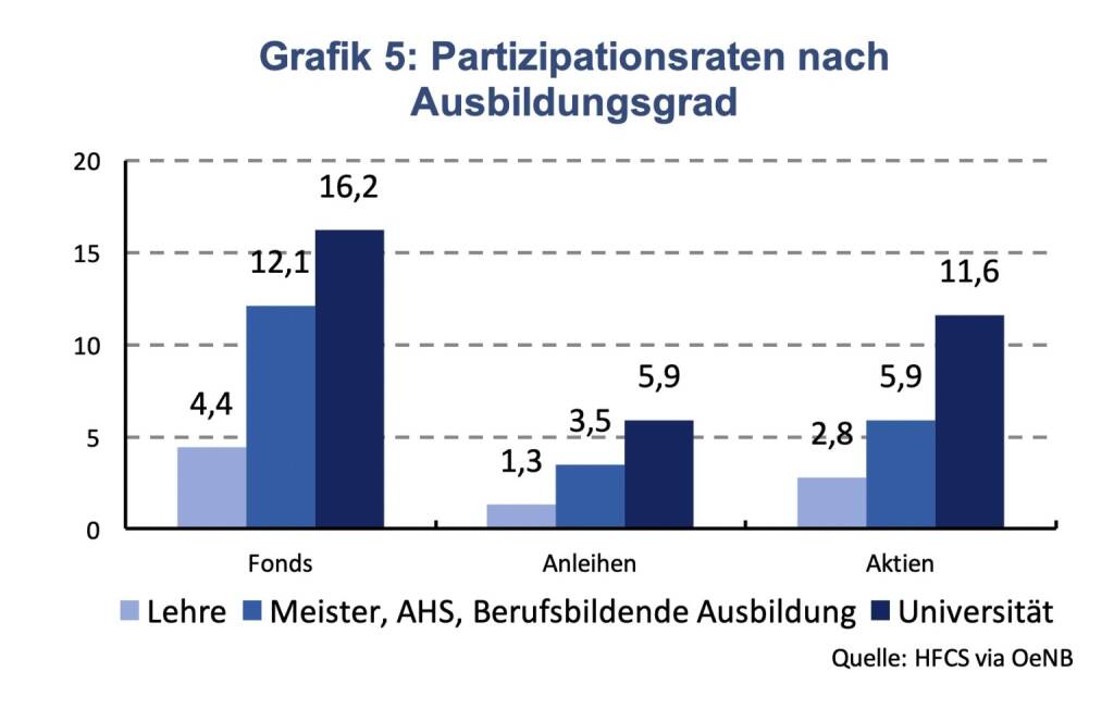 Trotz des durchschnittlichen Grads der Finanzbildung halten nur etwa 5 % österreichischer Haushalte Aktien. In der Eurozone sind es 9 %, in Deutschland sogar 10 %. Anhand der aktuellen Umfrage zur finanziellen Situation und zum Konsum der Haushalte (HFCS) lassen sich deutliche Unterschiede des Anlageverhaltens nach Ausbildungsgrad erkennen. Ist die höchste abgeschlossene Ausbildung eine Lehre, investieren nur 4,4 % in Fonds, 1,3 % in Anleihen und 2,8 % in Aktien (Grafik 5). In Haushalten mit akademischer Ausbildung ist die Wahrscheinlichkeit in risikoreichere Anlageformen zu investieren im Schnitt viermal so hoch.