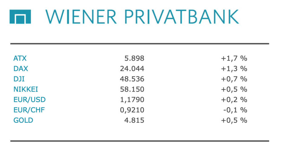 Aus den Morning News der Wiener Privatbank: "Die Wiener Börse hat gestern Dienstag mit deutlichen Gewinnen geschlossen. Der ATX beendete den Tag mit einem Plus von 1,74 Prozent bei 5.898,35 Punkten. Der breiter gefasste ATX Prime legte 1,72 Prozent auf 2.918,64 Zähler zu. Auch an anderen Börsen in Europa ging es nach oben. Angetrieben wurden die Märkte von der Hoffnung auf eine Fortsetzung der Gespräche zwischen dem Iran und den USA.