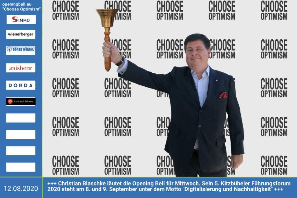 12.8.: Christian Blaschke läutet die Opening Bell für Mittwoch (Long Distance Style, vorher/nachher unter https://photaq.com//page/index/3781 ). Sein 5. Kitzbüheler Führungsforum 2020 steht am 8. und 9. September unter dem Motto "Digitalisierung und Nachhaltigkeit" http://www.fuehrungs-forum.com mehr Choose Optimism: https://boerse-social.com/category/choose_optimism https://www.facebook.com/chooseoptimism /