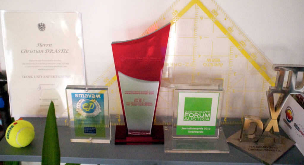 Nachdem ich vor Jahren einmal unter Tränen eine dreistellige Anzahl an Tennispokalen wegen Wohnungsumzug opfern musste, fange ich nun wieder ein neues Regal an. Beginn mit "Dank und Anerkennung durch Alfred Gusenbauer 2008", "Finance Blog of the Year 2012", die neue "Nummer 1 bei Österreich-Aktien in Deutschland 2015" in Rot-Weiss-Rot, der "Zertifikate Award für das Lebenswerk" 2012 und der "IVA David 2011" von Wilhelm Rasinger. Da ist man schon ein kleiner Ali Mahlodji (Ali von Whatchado gewinnt "gefühlt" jede Woche einen Award).