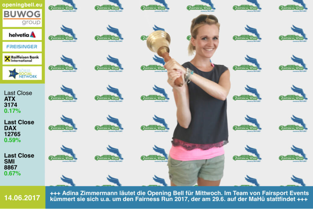 14.6.: Adina Zimmermann läutet die Opening Bell für Mittwoch. Im Team von Fairsport Events kümmert sie sich u.a. um den Fairness Run 2017, der am 29.6. auf der MaHü stattfindet http://www.fairnessrun.at/wien/ http://www.runplugged.com https://www.facebook.com/groups/Sportsblogged