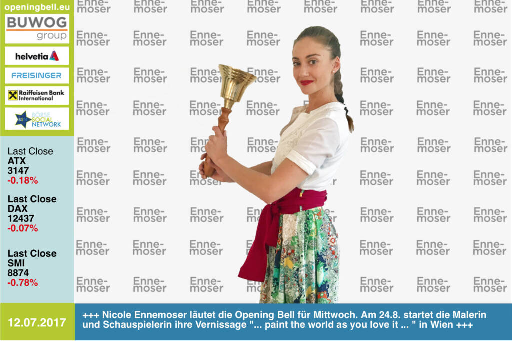 12.7.: Nicole Ennemoser läutet die Opening Bell für Mittwoch. Am 24.8. startet die Schauspielerin und Malerin ihre Vernissage "... paint the world as you love it ... " in Wien http://www.nicoleennemoser.com