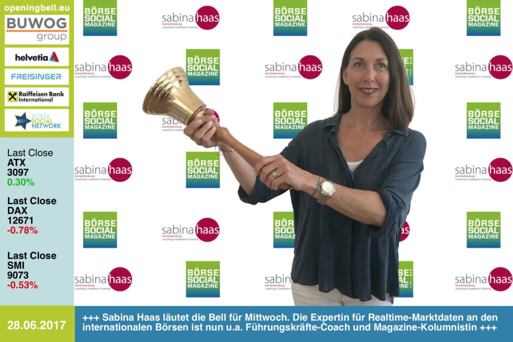 28.6.: Sabina Haas läutet die Opening Bell für Mittwoch. Die langjährige Realtime-Marktdaten-Expertin mit internationaler Finanzmarkterfahrung berät und coacht seit 6 Jahren Führungskräfte, MitarbeiterInnen und Teams bei beruflichen Veränderungsprozessen. Im Börse Social Magazine ist sie mit einer Kolumne vertreten. https://www.sabinahaas.at http://www.boerse-social.com/magazine https://www.facebook.com/groups/GeldanlageNetwork / #goboersewien