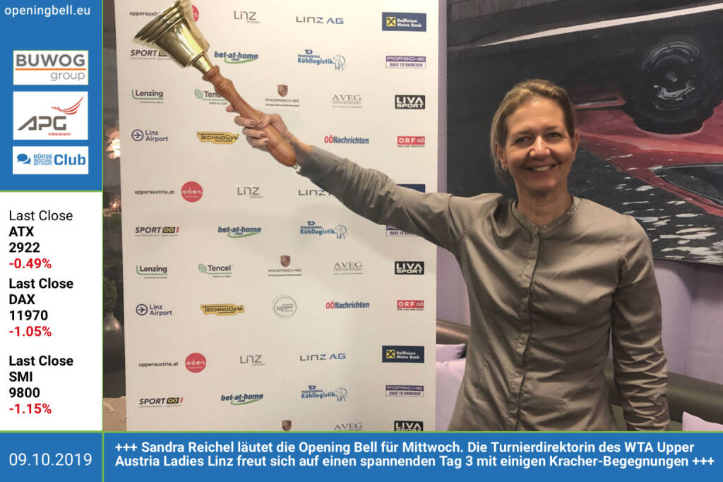 9.10.: Sandra Reichel läutet die Opening Bell für Mittwoch. Die Turnierdirektorin des WTA Upper Austria Ladies Linz freut sich auf einen spannenden Tag 3 mit einigen Kracher-Begegnungen https://www.ladieslinz.at/ http://www.sportgeschichte.at