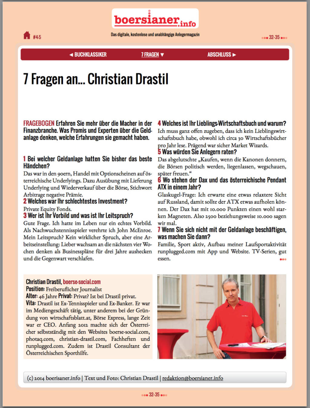 börsianer.info von Ulrich W. Hanke stellte mir für die Jahresendnummer 2014 insgesamt 7 Fragen. Da ich selbst gerade wieder neben den monatlichen Fachheften an einem PDF bastle, hab ich mir das Produkt genauer angeschaut. Hut ab, eine gute Sache, downloadbar hier.