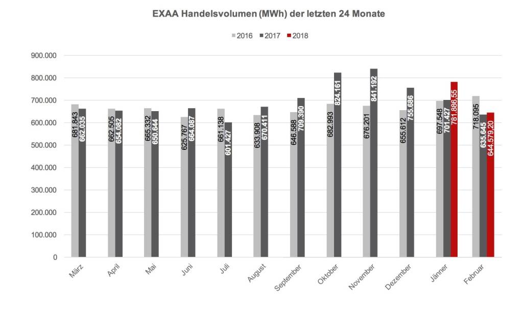 Im Magazine haben wir seit heuer auch die EXAA fix mit einer Seite dabei, das war mir wichtig, um auch mal die Preise und Zusammenhänge zu kapieren und sammelbar zu machen. Es war jedenfalls ein spannender Februar, der Aufwärtstrend hält an. Im Februar 2018 wurden 644.579 MWh an der EXAA gehandelt. Im Vergleich zum Vorjahresmonat (635.645 MWh) ein Anstieg von 1,4%. Siehe Grafiken hier.