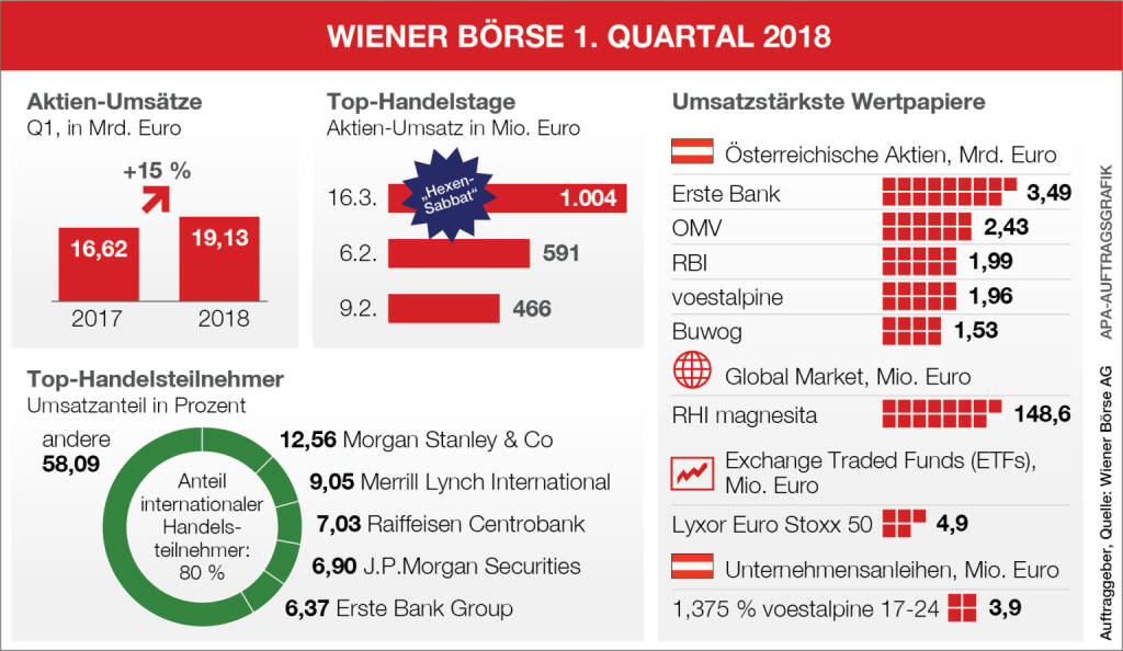 Im 1. Quartal 2018 verzeichnet die Wiener Börse bei Beteiligungswerten ein Handelsvolumen von satten 19,13 Mrd. EUR. Das entspricht einem Plus von 15 % im Vergleich zum Vorjahreszeitraum und einen durchschnittlichen Monatsumsatz von bereits wieder 6,38 Mrd. Euro. Ein fettes Plus gab es im Auktionshandel, jede dritte Order 2018 wurde im Rahmen einer Auktionausgeführt.