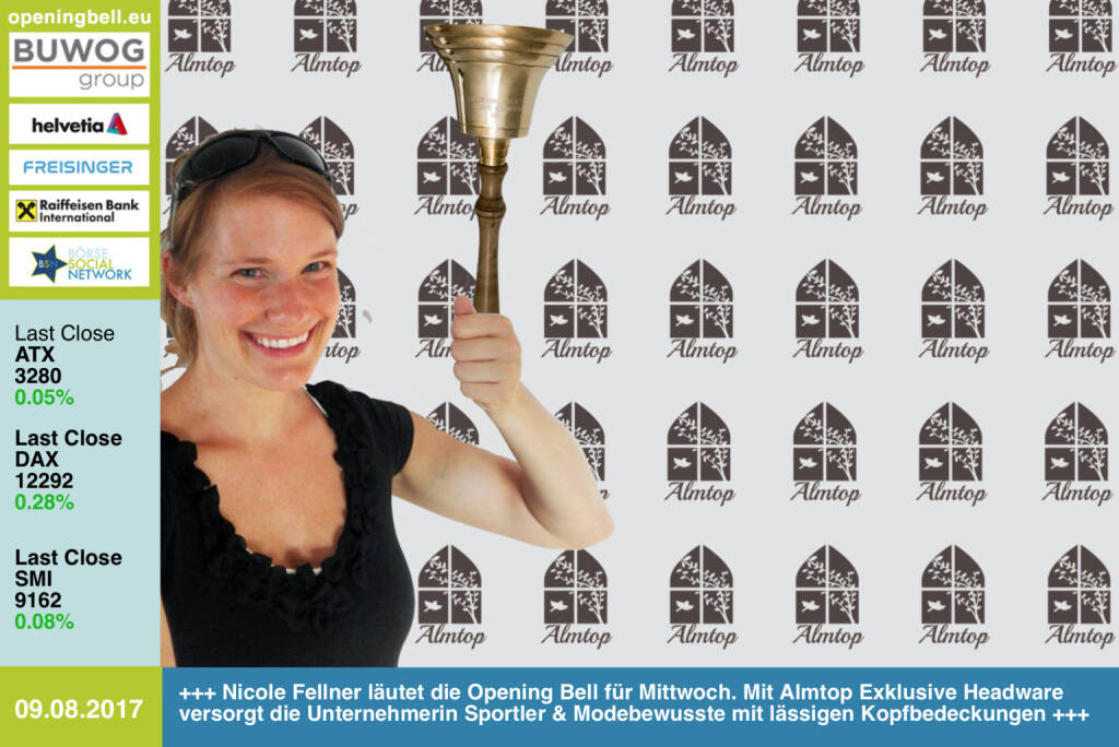 9.8.: Nicole Fellner läutet die Opening Bell für Mittwoch. Mit Almtop Exklusive Headware versorgt die Unternehmerin Sportler und Modebewusste mit lässigen Kopfbedeckungen https://www.facebook.com/Almtop-Exklusive-Headware-399728066874749/ https://www.facebook.com/groups/Sportsblogged/