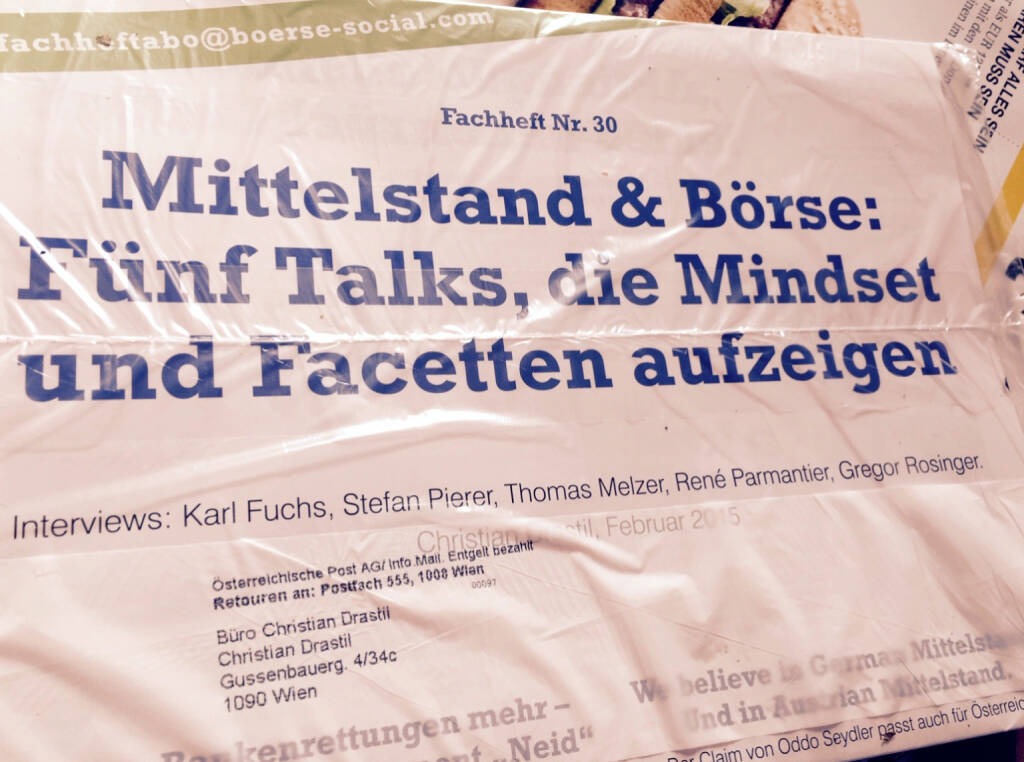 Die Ausgabe 30 unserer Fachhefte ist die erste, die via B2B-Versand und Jahresabo (30 Euro mailto:fachheftabo@boerse-social.com ) abonnierbar war. Davor hatten wir die Produkte bei Partnern und an wichtigen Finanzmarkt-Locations physisch aufgelegt und als PDF/Digital Paper (bisher jedes Heft mehr als 50.000 Impressions) kursieren lassen.