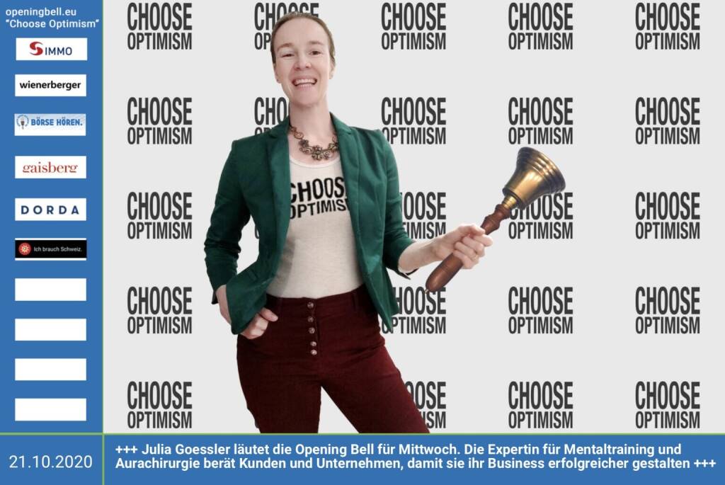 21.10.: Julia Goessler läutet die Opening Bell für Mittwoch, Long Distance Style (vorher/nachher unter https://photaq.com//page/index/3781). Die Expertin für Mentaltraining und Aurachirurgie berät Kunden und Unternehmen, damit sie ihr Business erfolgreicher gestalten http://juliagoessler.com . Mehr Choose Optimism: https://boerse-social.com/category/choose_optimism https://www.facebook.com/chooseoptimism/