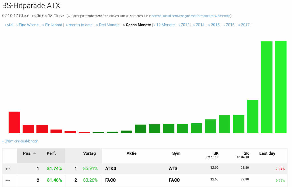 Als Statistik-Fan hier eine Grafik: Sie zeigt die 6 Monats Sicht im ATX. Die beiden Neulinge AT&S und FACC sind auch hier mit 81,7 vs. 81,5 Prozent Kursplus exakt gleichauf, nur Nuancen Unterschied, dazu das fast idente Kursniveau. Spooky. Die Grafik mit allen Details gibt es online HIER.