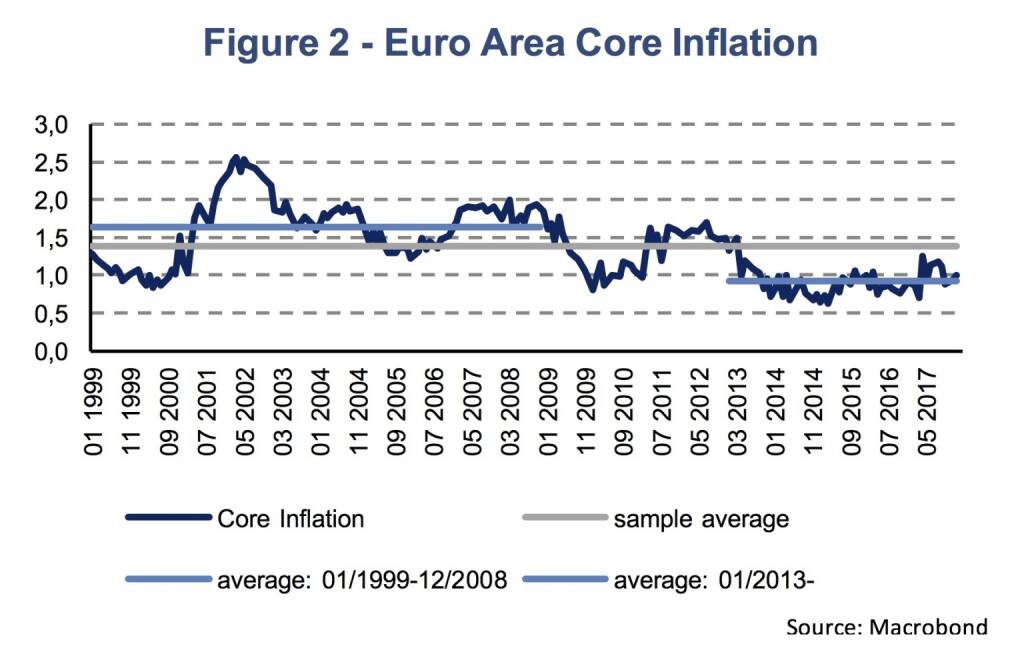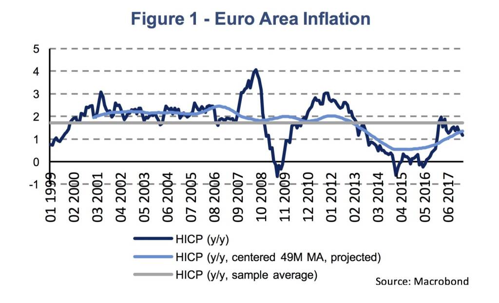 The ECB’s primary objective is to maintain price stability aiming inflation rates of below, but close to, 2 % over the medium term. Before the drop in prices following the financial crisis inflation averaged 2.2 % between 1999 and 2008 (Figure 1). The average over the total period since the introduction of the harmominsed index of consumer prices (HICP) in 1999 is 1.7 %. Over the medium term, which we define as a 4 year centered moving average, inflation has remained close to 2 % until 2013. It was only after 2013 that the ECB has consistently failed to achieve its price stability objective.[1]