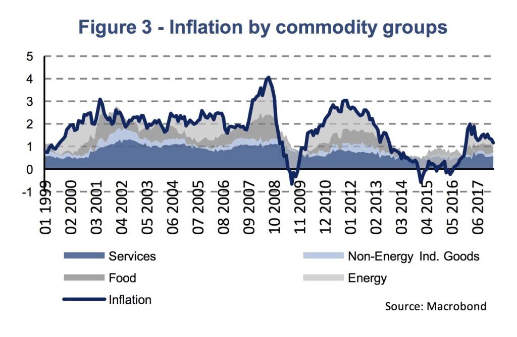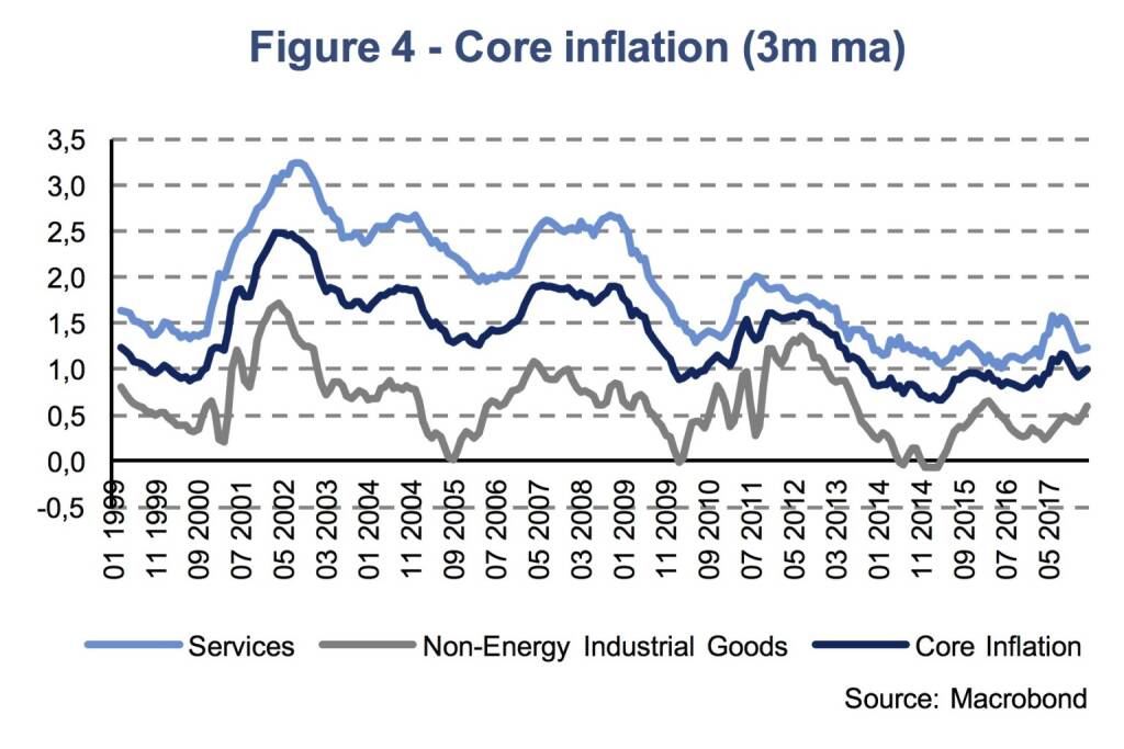 Overall, we conclude that an acceleration in service prices is crucial for Euro Area core inflation to converge to pre-crisis levels. Firstly, service price inflation tends to be higher than inflation in non-energy industrial goods (Figure 4). Secondly, service prices have by far the largest weight in the HICP index. Moreover, for the ECB to fulfil its inflation target support from non-core components is additionally needed. Ending on a positive note, we want to highlight that labor shares tend to be higher in service industries such that service prices should rise more strongly with wage increases.[2] Given the favorable macro-economic conditions, the strong cyclical movement and a further tightening of labor markets should support wage growth to accelerate.