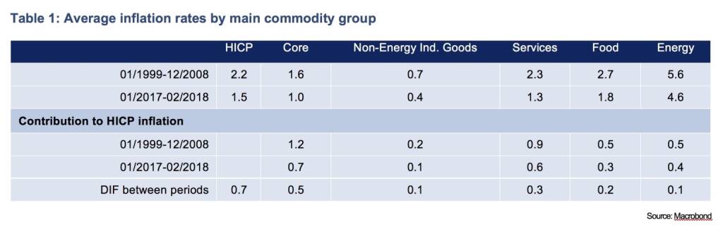 Decomposing Euro Area inflation by its main commodity groups, shows that more volatile energy and food, including alcohol & tobacco, prices have contributed significantly to Euro Area inflation in all periods (Figure 3). However, it also becomes evident that the main driver of core inflation is the price development of services. Prices of services increased by 2.3 % on average in the pre-crisis period. Since early 2017 the average inflation rate of services has only been at 1.3 %. Given that services have the largest weight in the overall inflation index (44.4 % in 2018), the subdue price development of services can be identified as the single most important reason why inflation remains below pre-crisis levels. Table 1 shows the average inflation rates by main commodity group for the pre-crisis period and the period starting in 2017. Moreover, the last three rows of table 1 give the contributions to the headline inflation rate. Services is the main factor. However, it is also important to note that no single group of commodities shows price developments above pre-crisis averages. The importance of service prices for HICP inflation is further emphasised by the fact that its weight in the HICP index has increased by 10 %-age points since 1998.