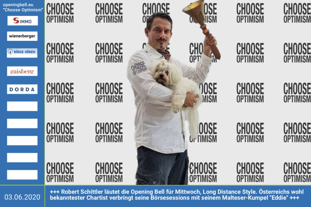 3.6.: Robert Schittler läutet die Opening Bell für Mittwoch, Long Distance Style (vorher/nachher unter https://photaq.com//page/index/3781 ). Österreichs wohl bekanntester Chartist verbringt seine Börsesessions mit seinem Malteser-Kumpel "Eddie" mehr Infos unter http://www.openingbell.eu mehr Choose Optimism: https://boerse-social.com/category/choose_optimism https://www.facebook.com/chooseoptimism /