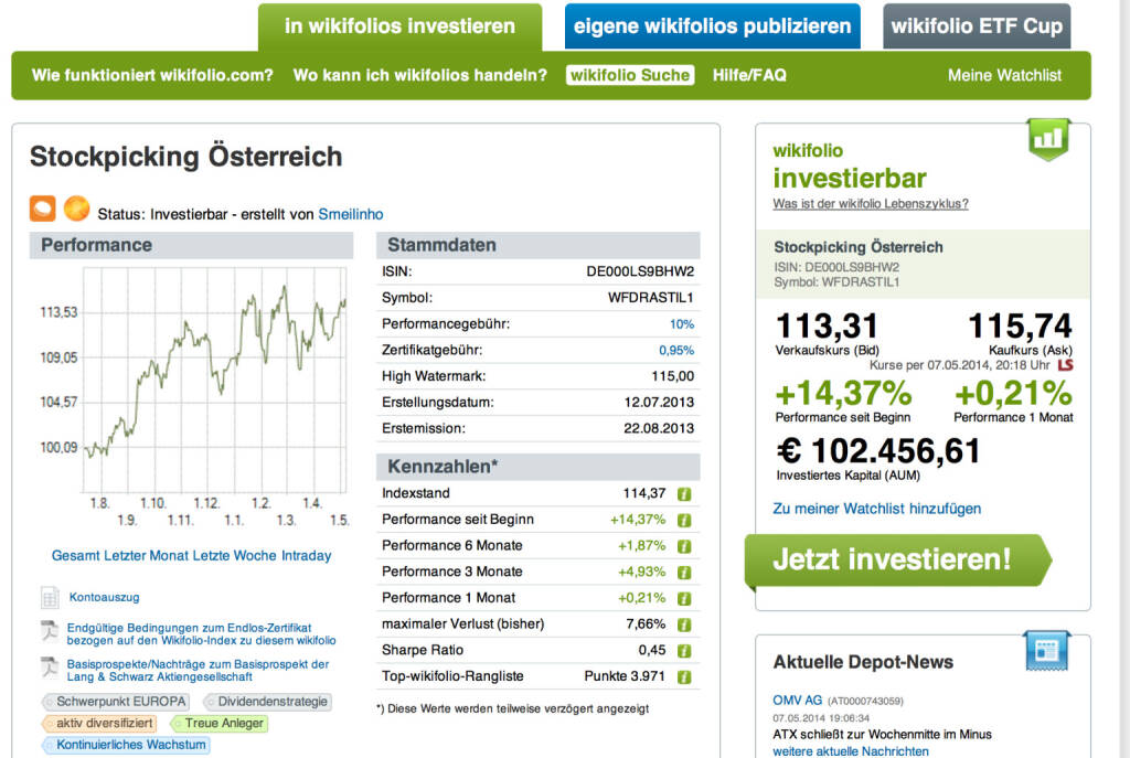 Bis dato haben Anleger 95.000 Euro in das Wikifolio-Zertifikat investiert. Bei einer Performance von knapp 13 Prozent seit Juli 2013 weist das Wikifolio einen maximalen Verlust von bisher 7,7 Prozent auf.