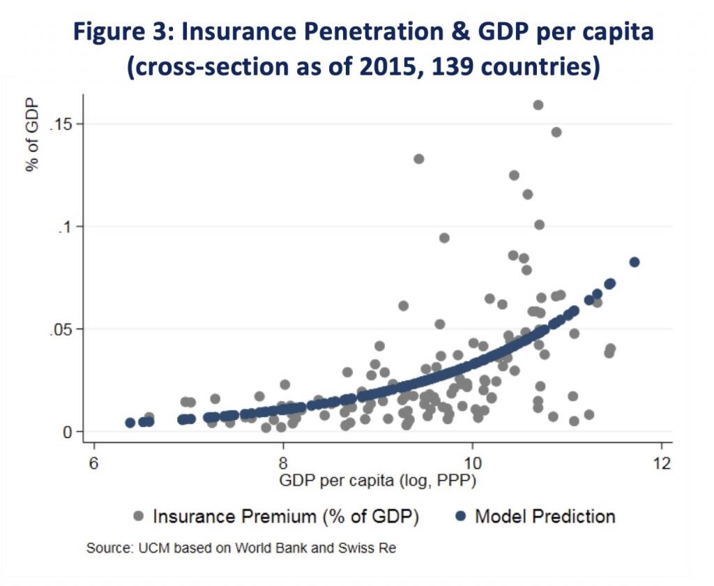 Looking at individual countries, rather than aggregates, shows more diversity, yet a positive correlation between income per capita and insurance penetration is clearly visible (correlation coefficient of 0.5). Figure 3 plots the logarithm of GDP per capita (PPP) in 2015 on the horizontal axis and insurance penetration for a sample of 139 countries (World Bank Global Financial Development Database) on the vertical axis. Insurance penetration is modelled by applying a generalized linear model (GLM) with a binominal model family and a logit link function (logistic regression) using the log of GDP per capita as the sole explanatory variable [2]. As expected, the model predicts a highly statistically significant positive relationship. Country specific deviations from the predicted insurance penetration occur in both directions.