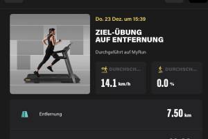 Gesamt 8,49 Km auf dem Technogym. Eigentlich wollte ich 40 Minuten lang so ein Abnehm-Programm laufen, das hat schon Spass gemacht, Laufband hat sich dauernd umgestellt, von ultralangsam bis recht ordentlich und mit Steigung von 4,0. Da wars dann auch, weil für Steigung 4,0 war das Kabel zu sehr gespannt und ist rausgegangen. Also Stopp bei 3,49 km nach 22:02 Min., der Screen unten zeigt 17:58 Restzeit an. Ich bin dann noch 5k langsam gelaufen. Aktivität: Lauf Dauer: 00:46:12 Distanz: 8 490 Pace: 05:26 km h: 11.04 Schuhe: Adidas App: Technogym MyRun Uhr: Apple Watch Runkit rechnet: Christian ist im Dezember bisher 148,010 km gelaufen, im Schnitt täglich 5,920 km, ein Minus von 10,94 Prozent gegenüber dem November, als Christian 6,648 km Tagesschnitt hatt... » Weiterlesen