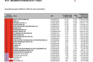 Um 12:09 liegt der ATX TR mit -0.51 Prozent im Minus bei 7504 Punkten (Ultimo 2020: 5466). Topperformer der PIR-Group sind UBM mit +1.92% auf 42.4 Euro, dahinter Porr mit +1.41% auf 12.98 Euro und DO&CO mit +1.17% auf 69.3 Euro. Zum Vergleich der DAX: 15301 (+0.82%, Ultimo 2020: 13719). Die Wiener Börse hat gestern nach Marktschluss die ATX (TR)-Beobachtungsliste 11 2021 veröffentlicht. Diese umfasst die Gesamtbörseumsätze 12 2020 bis 11 2021 der prime market-Werte. Sie hat 9 12 Bedeutung für die nächste Umstellung im März. Die Monate Dezember 2020 bis Februar 2021 werden noch durch Dezember 2021 bis Februar 2022 ersetzt.Und so sieht es aus. ATX (TR): Weiterhin sind die aktuellen 20 lt. Liste einzementiert. SBO hat sich nach Market Cap wieder mehr ... » Weiterlesen