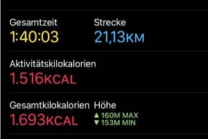 Ich schreibe den Beitrag um Sonntag um 20:30, um 10:00 machte ich noch einen relaxten Halbmarathon mit gutem Puls, Pace 4:44. Ich widme den Lauf meinen Partner LLB Österreich, so wie ich jedenHalbmarahoneinem Partner widme. Nun 3 Tage Laufpause, ich hab mir am Abend die Booster-Impfung mit Moderna im Austria Center (super organisiert) geholt. Davor nur 2x Astra Zeneca. Aktivität: Lauf Dauer: 01:40:03 Distanz: 21 130 Pace: 04:44 km h: 12.68 Schuhe: On App: keine Uhr: Apple Watch Runkit rechnet: Christian ist im November bisher 169,380 km gelaufen, im Schnitt täglich 8,65 km, ein Plus von 9,73 Prozent gegenüber dem Oktober, als Christian 7,351 km Tagesschnitt hatte. Christians Top-Monat bisher: November 2020 mit 10,999 km täglich. a href=" run... » Weiterlesen