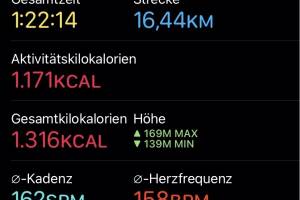 Heute erst in der Stadthalle, dann beim Tanzquartier Wien und am Abend noch ein lockerer Lauf, wobei die Apple Watch die Herzfrequenz zunächst lange nicht angezeigt hat und dann mit 158bpm, irgendwas hat da heute nicht gepasst, vielleicht wegen der Handschuhe. Aktivität: Lauf Dauer: 01:22:14 Distanz: 16 440 Pace: 05:00 km h: 12.00 Schuhe: Asics App: Runplugged Uhr: Apple Watch Runkit rechnet: Christian ist im Oktober bisher 149,810 km gelaufen, im Schnitt täglich 6,513 km, ein Minus von 4,91 Prozent gegenüber dem August, als Christian 6,850 km Tagesschnitt hatte. Christians Top-Monat bisher: November 2020 mit 10,999 km täglich. >> Zum Runkit Profil von Christian Drastil Weitere Einträge bzw. selbst gratis anmelden, Aktivitäten... » Weiterlesen