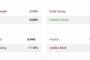 Geburtstage: 15.10.1950: Wolfgang Ruttenstorfer (OMV) 15.10.1966: Heimo Scheuch (Wienerberger) Extrema: 15.10.2008: Flop 1: Agrana: -12.38% - [Flop 2: -11.16% (18.11.2008), Flop 3: -10.9371% (01.02.2017)] zum Kalender 15.10.2008: Flop 3: Immofinanz: -33.33% - [Flop 1: -47.83% (25.11.2008), Flop 2: -36.05% (18.09.2008)] zum Kalender 15.10.2008: Flop 1: RBI: -24.66% - [Flop 2: -17.81% (08.10.2008), Flop 3: -15.77% (27.10.2008)] zum Kalender 15.10.2008: Flop 2: voestalpine: -15.56% - [Flop 1: -15.7351% (12.03.2020), Flop 3: -14.33% (05.11.2008)] zum Kalender Gleichbleibende Serie in Tagen: 15.10.2001: UBM: Längste gleichbleibende Serie: 8 Tage (endete am 15.10.2001) zum Kalender Positive Serie in Performance: 15.10.2008: Palfinger: Beste Performance Serie: 32.... » Weiterlesen