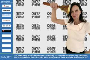 26.4.: Nadia Weiss läutet die Opening Bell für Montag. Die Journalistin hat einen Tipp parat: SHEbriefly, den Gratis-Newletter des Sheconomy Wirtschaftsmagazins, dieser erscheint jeden Montag. Anmelden: sheconomy.media newsletter Choose Optimism: boerse-social.com category choose_optimism www.facebook.com chooseoptimism 23.4. : Cornelia Habacher und Philipp Stangl läuten die Opening Bell für Freitag. Mit ihrem Wiener Start-Up Rebel Meat wollen sie das Fleischregal mit halb Fleisch, halb Veggie Würsteln, Burgern & Co. aufmischen www.rebelmeat.com Choose Optimism: boerse-social.com category choose_optimism www.facebook.com chooseoptimism 30.3.: Denise Fischer läutet die Opening Bell für Dienstag. Die Vertriebsexpertin verstärkt... » Weiterlesen