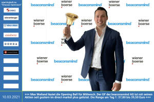 10.3. Max Weiland läutet die Opening Bell für Mittwoch. Der GF der beaconsmind AG ist mit seinen Aktien seit gestern im direct market plus gelistet. Die Range am Tag 1: 37,80 bis 39,50 Euro www.beaconsmind.com investor-relations http: www.wienerborse.at 9.3.: Elisabeth Falkner läutet die Opening Bell für Dienstag. Seit 1. März 2021 ist sie als Head of Investor Relations für die Leitung der IR-Abteilung der Wienerberger-Gruppe verantwortlich http: www.wienerberger.com Choose Optimism: boerse-social.com category choose_optimism www.facebook.com chooseoptimism 2.3.: Manuel Taverne läutet die Opening Bell für Dienstag. Nach Stationen bei der Telekom Austria, Polytec und zuletzt FACC ist er nun für die IR der Knaus Tabbert AG (D) verant... » Weiterlesen