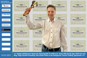 10.2.: Stefan Waldhauser läutet die Opening Bell für Mittwoch. Beim VBV Smeil Alps 2020 hat sein Blog "High-Growth-Investing" den ersten Platz in der Kategorien "Social Trading" gewonnen - Gratulation! http: high-tech-investing.de http: smeil-award.com http: vbv.at mehr Choose Optimism: boerse-social.com category choose_optimism www.facebook.com chooseoptimism 9.2.: Alexandra Rosinger läutet die Opening Bell für Dienstag. Beim VBV Smeil Alps 2020 hat ihr Blog "FinancialRedHead" den dritten Platz in der Kategorien "Einzel" gewonnen - Gratulation! www.financialredhead.com blog http: smeil-award.com http: vbv.at mehr Choose Optimism: boerse-social.com category choose_optimism www.facebook.com chooseoptimism 8.2.: Wolfgang Matejka läutet die Op... » Weiterlesen