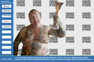 24.6.: Humungus läutet die Opening Bell für Mittwoch, Long Distance Style (vorher nachher unter photaq.com page index 3781 ). Nach langer Durststrecke ist es am 5.7. im Weberknecht - siehe http: www.wrestlingschoolaustria.at events05jul20.htm - endlich wieder soweit: Die Publikumslieblinge der World Underground Wrestling – hier im Bild Humungus, ihr Chef – lassen es wieder krachen! In die Goschn! Humungus freut sich über Österreichs erstes Wrestling-Magazin "In die Goschn", das im Herbst erstmalig erscheinen wird. mehr Infos unter http: www.openingbell.eu mehr Choose Optimism: boerse-social.com category choose_optimism www.facebook.com chooseoptimism Humungus: „Da kommt noch einiges auf uns zu! Challenge accepted?“ 23.6.: Tobias Schiegl ... » Weiterlesen