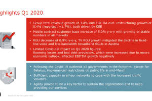 Zur Orientierung: Der ATX lag mit den Schlusskursen von gestern ytd bei -34,12 Prozent , der DAX bei -16,48 Prozent und der Dow Jones bei -14,24 Prozent. Heute sieht es erneut schwächer aus, Trump legt sich mit Russland und China an und das bei US-Arbeitslosenzahlen von 17,2 Prozent. Neu in der Austrian Visual Worldwide Roadshow ist heute die Telekom Austria : boerse-social.com austrianworldwideroadshow presentation a1_telekom_austria 3806 [pic2] Statement des Unternehmens: "Die grundlegenden positiven Trends der letzten Quartale setzten sich über weite Strecken im 1. Quartal 2020 mit stabilen oder wachsenden Erlösen aus Dienstleistungen und einem Anstieg des EBITDA in Weißrussland, Bulgarien, Kroatien und Serbien fort . Da sich die Verbreitung von Covid-19 ... » Weiterlesen