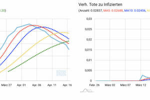 16 4. 15 Uhr: Die Zahl der aktuell Erkrankten ist nur noch knapp über 5000, die Relation Todesfälle zu gesamt Erkrankte strebt aber gegen 3 Prozent About: ImBörse Social Covid 19 Monitor, siehe www.boerse-social.com covid19 , sehen wir uns täglich für Österreich gesamt und die 9 Bundesländer mehrere Charts an: Infektionen gesamt, Neuansteckungen absolut und in Prozent, aktuell Erkrankte, Verstorbene und Gesundete. Täglich aktualisiert basierend auf den 15:00-Werten von info.gesundheitsministerium.at Dazu rücken wir mit Charttechnik an: Anzahl vs. 5 Tage (rot) vs. 10 Tage (dunkelblau) vs. 20 Tage (gelb) gleitender Durchschnitt (MA, Moving Average) vs. 30 Tage (grün). Weitere Map-Anwendungen: >> Zur Finanzmap >> Zur Runmap auf runplugge... » Weiterlesen