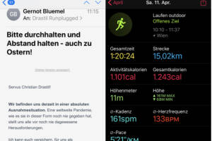 Seit Ende Februar war im maximal 10k am Stück gelaufen, meist drin am Laufbank, längere Distanzen will ich den Nachbarn nicht antun. Heute hat es sich ergeben, dass ich bei meinen Eltern vorbeilaufen konnte und über den Gartenzaun ein paar Minuten plaudern. Das tat verdammt gut, Leute. Hatte sie seit einem Monat nicht gesehen und das war sonst nie so. Habe wieder Strecken gewählt (Stichwort: Seitengassen, Feldwege), auf denen man so gut wie keine Menschen trifft. Schmunzeln musste ich, dass nach dem Lauf ein Mail von Gernot Blümel da war. Bitte durchhalten! Hab ich eh, denn es war eine langsamer (bewusst Pace 1 Min. langsamer als der letzte Zehner, also heute 5:21), Puls 133 hat sich auch so locker angefühlt. Aber ich weiss, dass Gernot Blümels Team das anders gemeint ha... » Weiterlesen