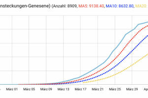 5.4. 15 Uhr: Covid 19: Die Kurve Erkrankte minus Gesundete ... und sie fällt, gestern unter den MA5 gegangen. Jede(r) Gesundete ist Hoffnung auf Plasmaspenden & Co.. About: ImBörse Social Covid 19 Monitor, siehe www.boerse-social.com covid19 , sehen wir uns täglich für Österreich gesamt und die 9 Bundesländer drei Charts an: Infektionen gesamt, Neuansteckungen absolut und in Prozent.Täglich aktualisiert basierend auf den 15:00-Werten von info.gesundheitsministerium.at Dazu rücken wir mit Charttechnik an: Anzahl vs. 5 Tage (rot) vs. 10 Tage (dunkelblau) vs. 20 Tage (gelb) gleitender Durchschnitt (MA, Moving Average). Weitere Map-Anwendungen: >> Zur Finanzmap >> Zur Runmap auf runplugged.com >> White Label: Treffpunkt Essling » Weiterlesen