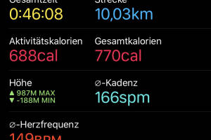 Heute hat mal alles gepasst, das hab ich gleich auf den ersten 500 Metern gespürt und als ich dann auf der Runplugged-App "Kilometer 1 in 4:40" hörte, dachte ich, dass ich da mal jetzt einen zügigen Lauf probiere, das Schöne ist, dass ich am Wochenende in Gegenden laufen kann, in denen fast garantiert überhaupt niemand ist. So Motto: 2 Leute auf 10 Kilometer. Und so wars dann auch. Hab die 10k in 46:08 absolviert, alle Kilometer zwischen 4:30 und 4:40. Aktivität: Lauf Dauer: 00:46:08 Distanz: 10 030 Pace: 04:35 km h: 13.09 Schuhe: Adidas App: Runplugged Uhr: Apple Watch Runkit rechnet: Christian ist im April bisher 34,560 km gelaufen, im Schnitt täglich 6,912 km, ein Plus von 290,65 Prozent gegenüber dem März, als Christian 1,769 km Ta... » Weiterlesen