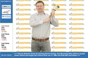 6.3.: Thomas Böttcher läutet die Opening Bell für Freitag. Sein Börsentag Wien 2020 im Austria Center Vienna wird wegen des Corona-Virus von 21. März auf Ende Mai verschoben. Updates unter http: www.boersentag.at 5.3 . : Die "Vom Start-up zum Börsekandidaten"-Autoren Josef Schmidt, Philipp Schrader , Ralf Kunzmann und Christoph Boschan mit der Opening Bell für Donnerstag. In dem Nachschlagewerk geben sie rechtliche und steuerliche Tipps zu Finanzierungen bis hin zu Börsefitness ; www.lindeverlag.at 4.3.: Wilhelm Hörmanseder läutet die Opening Bell für Mittwoch. Der langährige Mayr-Melnhof-CEO wird in wenigen Wochen an Peter Oswald übergeben. Davor erfolgt aber noch das Comeback der Mayr-Melnhof-Aktie im ATX 3.3.: ... » Weiterlesen