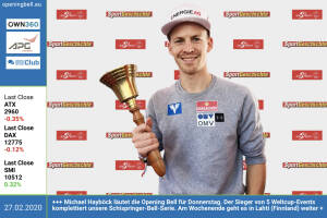 27.2.: Michael Hayböck läutet die Opening Bell für Donnerstag. Der Sieger von 5 Weltcup-Events komplettiert unsere Schispringer-Bell-Serie. Am Wochenende geht es in Lahti (Finnland) weiter http: www.sportgeschichte.at http: www.oesv.at 26.2.: Philipp Aschenwald läutet die Opening Bell für Mittwoch. Der Tiroler ist derzeit zweitbester Österreicher im Weltcup der Schispringer. Am Wochenende geht es im finnischen Lahti weiter http: www.sportgeschichte.at http: www.oesv.at 25.2.: Silvia Wendecker, Stefan Artner, Carlos Fernandez de Retana und Karin Kreutzer läuten die Opening Bell für Dienstag. Mit "Startup Investing" haben sie ein Standardwerk geschaffen www.lindeverlag.at buch startup-investing-18355 . Ein Kapitel bei uns auch unter... » Weiterlesen