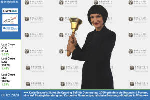 6.2.: Karin Brauneis läutet die Opening Bell für Donnerstag. 2000 gründete sie Brauneis & Partner, eine auf Strategieberatung und Corporate Finance spezialisierte Beratungs-Boutique in Wien www.brauneis-partner.at 5.2.: Hermann Egger läutet die Opening Bell für Mittwoch. Der Geschäftsführer der Hohenhaus Tenne Schladming bewirtete letzte Woche beim Nachtslalom eine illustre Gäste-Schar http: tenne.com http: www.sportgeschichte.at 4.2.: Stefan Kraft läutet die Opening Bell für Dienstag. Österreichs Schispringerstar feierte am Wochenende in Sapporo seinen 18. Weltcupsieg und führt jetzt im Gesamtweltcup 2019 2020 http: www.oesv.at http: www.sportgeschichte.at 3.2.: Wilhelm Rasinger läutet die Opening ... » Weiterlesen