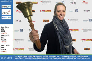 28.1.: Xenia Daum läutet die Opening Bell für Dienstag. Die Ex-Volleyballerin und Digitalexpertin holte Rang 2 beim Business Athlete Award. http: www.sportgeschichte.at baa http: www.sdo.at photaq.com page index 3767 27.1.: Stefan Rathausky läutet die Opening Bell für Montag. Der "Merger Manager" der RHI Magnesita und mehrfache Staatsmeister mit dem Säbel ist "Business Athlete des Jahres" , Bilder unter photaq.com page index 3767 . Mehr dazu im aktuellen http: www.boerse-social.com magazine www.rhimagnesita.com de 23.1.: Daniel Folian läutet die Opening Bell für Freitag. Seine Warimpex-Aktie schrieb im Jahr 2019 Börsegeschichte. Sie war die Nummer 1 im ATXPrime der Wiener Börse. Mehr dazu im #gabb http: www.warimpex.com ... » Weiterlesen