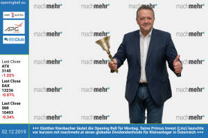 3.12.: Heinz Wipplinger läutet die Opening Bell für Dienstag im Rahmen der Own Austria Invitation. Der Fahrradprofi von Enzovelo (Schwerpunkt Alltags- und Reiseräder) wünscht einen feinen Handelstag http: www.enzovelo.at 2.12..: Günther Kienbacher läutet die Opening Bell für Montag. Seine Primus Invest (Linz) launchte vor kurzem mit machmehr.at einen globalen Dividendenfonds für Kleinanleger in Österreich www.machmehr.at 29.11.: Paul Severin und Armand Feka läuten die Opening Bell für Freitag. Die beiden Communications-Experten bei der Erste Asset Management luden kürzlich zum Marktausblick http: erste-am.at 28.11.: Christian Schmidt läutet die Opening Bell für Donnerstag. Der neue IR-Chef des Flughafen Wien m... » Weiterlesen