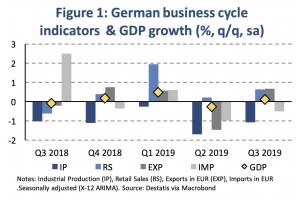 Business and sentiment indicators have stabilized at low levels, a turning point has not yet been fully confirmed by the data. The German economy has avoided a technical recession in Q3 with 0.1 % GDP growth. Manufacturing industries remain in contraction. Growth in CEE countries continues to be above the EU average, being particularly strong in Poland and Hungary. During the third quarter, the Euro Area economy has avoided a further deterioration in economic momentum. GDP growth has been confirmed at 0.2 % (quarter-on-quarter, seasonally adjusted), which is unchanged to the previous quarter. Further, the expected technical recession in Germany (two consecutive quarters of negative q q GDP growth) has not materialized. The pace of economic expansion seems to have stabilized for now at a moderat... » Weiterlesen
