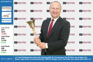 7.11.: Paul Rettenbacher läutet die Opening Bell für Donnerstag. Der IR-Mann der Polytec hat dieser Tage Gutes zu kommunizieren: EBITDA-Marge 10,2%, die Aktie war zuletzt sehr stark iaa.polytec-group.com http: www.boerse-social.com polytec 6.11.: Christian Morzsa läutet die Opening Bell für Mittwoch. Seit August kümmert sich der Marketing & Communications Manager bei wikifolio.com um PR und Medienpräsenz. wikifolio.com www.facebook.com groups GeldanlageNetwork 5.11.: Opening Bell für Dienstag: Es läuten technik bewegt-Veranstalterin Sabine Gstöttner, Marion Gruber (plov Architekten), Andrea Rochelt (UBM), Franz Klager (Strabag), Leya Hempel (BSN) http: www.bink.at technik-bewegt 4.11.: Remember Halloween 2019: Das war ... » Weiterlesen