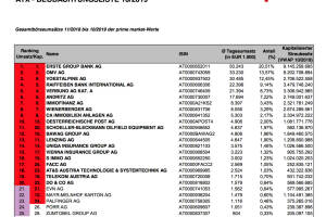 Liebe Leser!Die Wiener Börse hat die ATX-Beobachtungsliste 10 2019 veröffentlicht. Diese umfasst die Gesamtbörseumsätze 11 2018 bis 10 2019 der prime market-Werte. Sie hat 8 12 Bedeutung für die nächste reguläre Umstellung per März-Verfall. Und so sieht es aus: Die 20 ATX Werte wären nach wie vor bestätigt. Die 20 Stärksten nach Handelsvolumen sind auch unter den Top25 nach Market Cap. FACC (25) bleibt also vor Porr (26). Mayr-Melnhof ist nach dem Sonderschwung im August wieder etwas zurückgefallen. Ein heisser Kandidat wird aber die EVN, die schon knapp an der Do&Co dran ist in der wichtigeren Umsatzkategorie und auch das Market Cap Kriterium erfüllt. Unser Tipp für den März. » Weiterlesen