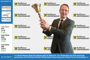 23.10.: Bernd Maurer läutet die Opening Bell für Mittwoch. Der Chefanalyst der RCB wird heute gemeinsam mit Christoph Schultes (Chefanalyst Erste Group) den Closed Circle #4 bestreiten. Thema: Research für jungen Menschen. Bilder zu den Closed Circles #1 - #3 hier: photaq.com page index 3704 http: www.rcb.at www.erstegroup.com 22.10.: Stefan Pierer läutet die Opening Bell für Dienstag. Aus seiner KTM Industries wurde dieser Tage die Pierer Mobility AG. Das neue Börsekürzel heisst PMAG, die ISIN bleibt unverändert. Ein Aktienrückkaufprogramm beginnt 21.10.: Dominic Thiem läutet die Opening Bell für Montag. Österreichs Tennis-As ist bei den heute startenden und mit 2.433.810 Euro dotierten Erste Bank Open in der Wiener... » Weiterlesen