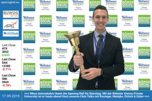 17.9.: Nikos Antonakakis läutet die Opening Bell für Dienstag. Mit der Webster Vienna Private University ist er heute abend Host unseres Club-Talks mit Rosinger, Matejka, Öztürk & Eisler http: www.boerse-social.com club 16.9.: Natalie Ransauer und Nefize Can läuten die Opening Bell für Montag. Als Team für Kommunikation, Marketing und Events spielen die beiden entscheidende Rollen beim Börsianer Festival 19 boersianer-festival.com 13.9.: Thomas Schweda läutet die Opening Bell für Freitag. Der ÖTV-Geschäftsführer und Ex-Tenniscrack drückt ab heute beim Davis-Cup in Finnland (heute Dominic Thiem und Dennis Novak im Einsatz) die Daumen http: www.oetv.at http: www.sportgeschichte.at 12.9.: Helmut La... » Weiterlesen