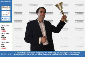 17.6.: Armin Moghaddam läutet die Opening Bell für Montag. Der Herausgeber vom Infoportal broker-vergleich.com ist seit 20 Jahren Swingtrader, hauptsächlich an den US-Börsen www.broker-vergleich.com www.facebook.com groups GeldanlageNetwork 14.6.: Carolina Burger läutet die Opening Bell für Freitag. Die Kommunikatorin wechselte unlängst von der Uniqa zu Novomatic. Der Finanzblogger-Award Novomatic Smeil Alps 2019 startet Anfang Juli http: www.smeil-award.com http: www.novomatic.com 13.6.: Thomas Pusterhofer und Vera Buttinger mit der Opening Bell für Donnerstag. Mit der RCB und unseren anderen Zerti-Partnern entwickeln wir gerade ein neues Zertifikate-Tool für BSN www.rcb.at www.facebook.com groups GeldanlageNetwork 12.6.: Bojan T... » Weiterlesen